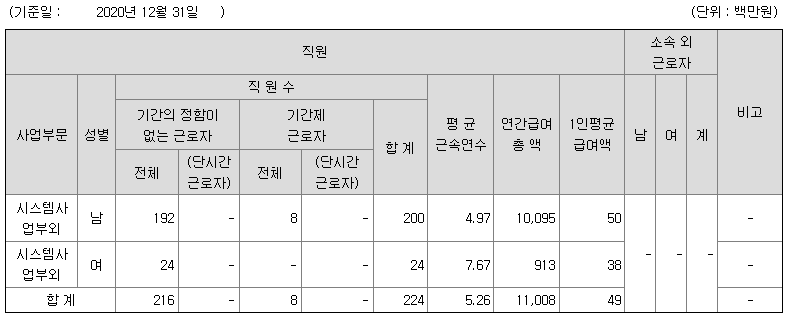 평균 근속연수는 남자 4년 9개월, 여자 7년 6개월로 여자의 근속 연수가 높은 편이다.