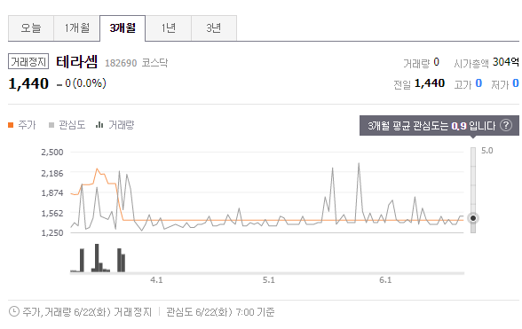 테라셈의 주가는 1,440원으로 3월말 거래정지를 먹었다.