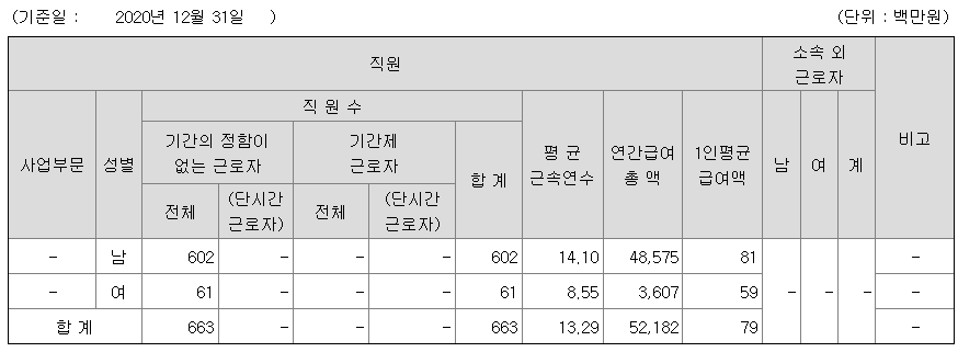 송원산업의 2020년 직원 평균연봉 데이터이다.