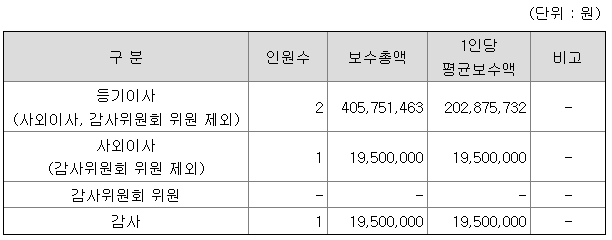 등기이사 연봉은 2억원, 사외이사는 천9백만원, 감사도 동일한 천9백만원으로 나왔다.