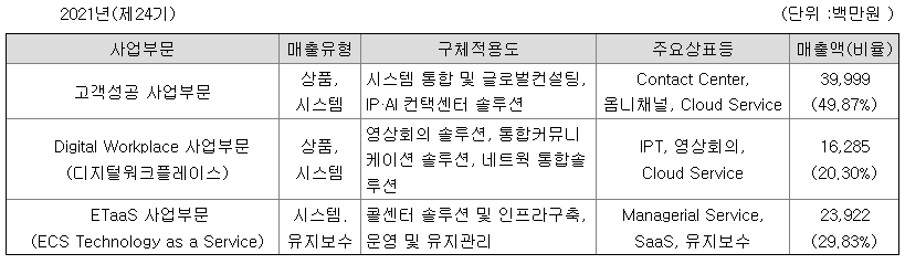 (주)이씨에스텔레콤은 Enterprise Communication Solutions사업의 오랜 경험을 기반으로 고객성공 영역과 디지털워크플레이스 영역을 주사업으로 하고 있습니다. 고객성공 영역은 기존의 컨택센터 인프라 부문, 고객경험(CX, Customer Experience) 부문, 상담사 경험(AX, Agent Experience) 부문, ROI 부문, 관리(Management) 부문, 세일즈/마케팅 부문, 자동화 부문, 컴플라이언스 부문으로 구성되어 있습니다.