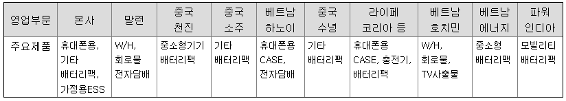 배터리팩은 본사에서 휴대폰용, 청소기용, ESS용 등을 위주로 생산하고 있으며, 중국에서 청소기용, 전동공구용, 기타소형기기용 등을, 베트남에서 전동공구용, 청소기용, E-bike용 등을, 인도에서 휴대폰용 배터리팩을 생산하고 있습니다. 휴대폰용 Case는 베트남 하노이와 인도에서 생산하고 있으며, 휴대폰용 충전기는 인도에서 생산하고 있습니다. TV 및 기타 가전제품에 사용되는 부품은 말련 및 베트남 호치민에서 생산하고 있습니다. 신규로 진행하는 궐련형 전자담배는 말련법인에서 생산하고 있으며, 하노이법인에서 신규로 생산하고 있습니다.