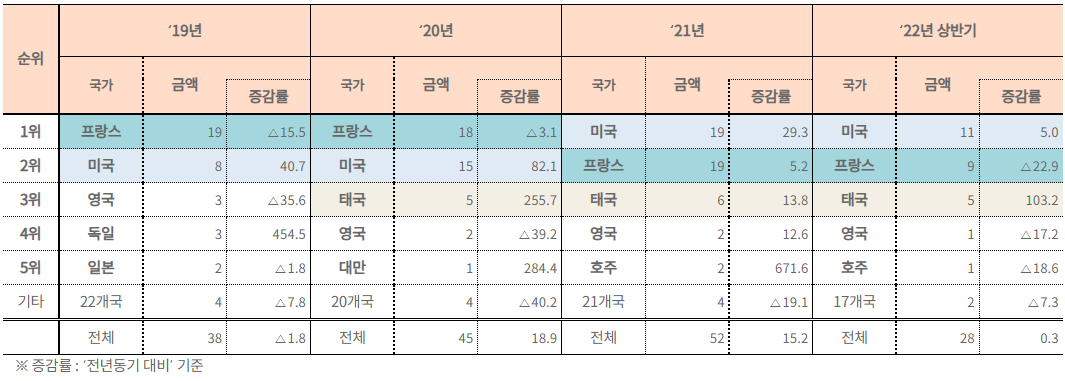 ㅇ ’22.상, 최대 수입국은 1)미국, 2)프랑스, 3)태국 순으로, 전체 수입액 중 각각 38%(11백만$, 전년동기 대비 5.0%↑), 32%(9백만$, 22.9%↓), 19% (5백만$, 103.2%↑)를 차지