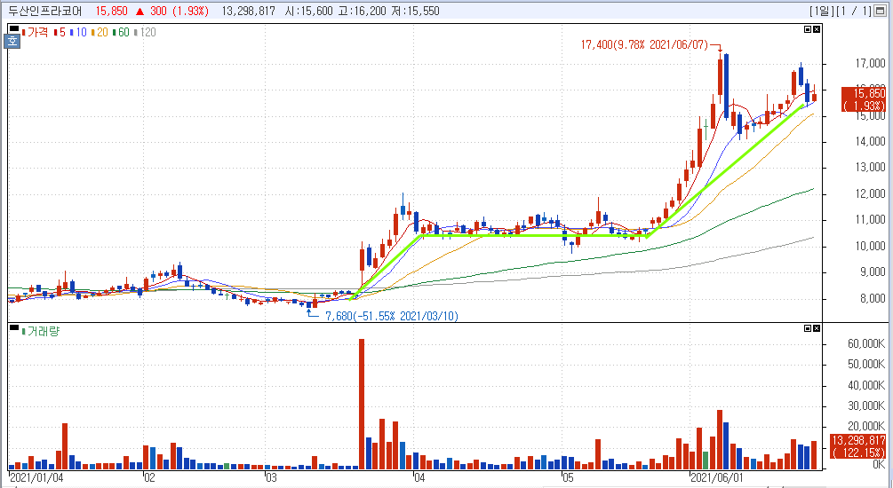 두산인프라코어의 차트를 살펴보면, 계단식 횡보를 보여주고 있다.
