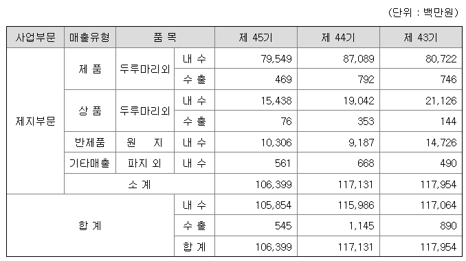 2021년 영업실적은 매출액 106,399백만원으로 전년 동기대비 약 9.2%, 영업이익은3,434백만원으로 약 63.2% 감소한 실적을 기록하였습니다. 대내외 경영환경의 불확실성 확대로 인한 소비심리 위축을 비롯하여, 펄프가격 인상, 물류비상승, 원료가 인상 등의 부정적요소가 영업이익 하락의 주요원인입니다. 향후 미래의잠재적 위기상황에 대비하기 위하여, 신규 화장지 가공설비를 통한 안정적인 생산을 토대로, 수출시장과 E-Commerce 시장의 입지를 확보하는 한편, 위생부문에 있어서도 물티슈 생산설비 내재화 및 안정화를 통해 원가 경쟁력을 확보하여 매출 확대를 계획하고 있습니다.