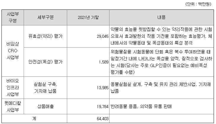 사람의 질병치료를 목적으로 하는 의약품 개발과정에 있어서 실험동물을 대상으로 물질을 테스트하는 비임상 CRO 사업을 영위함.