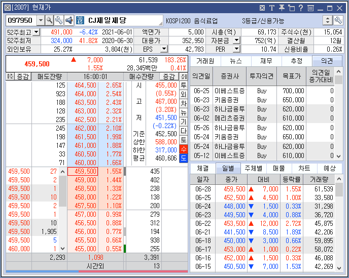 CJ제일제당은 코스피에 상장되어 있으며 음식료업에 해당된다.