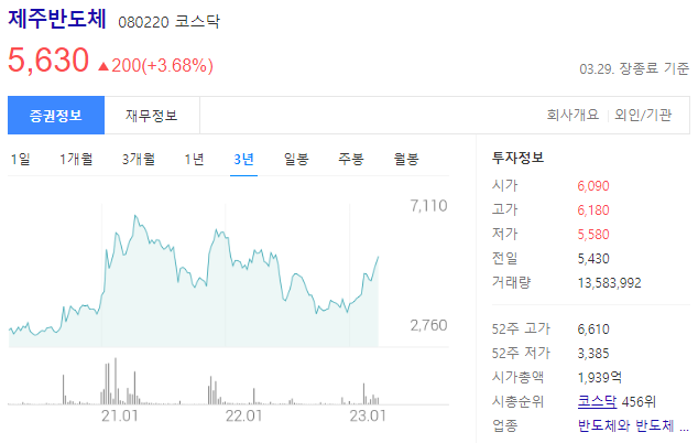 제주반도체는 코스닥 상장사로 주가는 5630원이다.