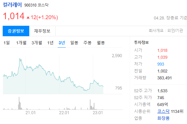 컬러레이 주가는 1014원으로 52주 고가 1635원, 52주 저가는 746원이다. 컬러레이 시가총액은 649억원으로 시총순위 코스닥 1134위이다.