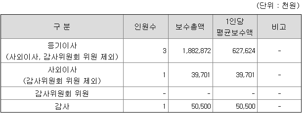 등기이사 6억2천마원, 사외이사는 3천9백만원, 감사는 5천만원의 임원 평균연봉으로 산출되었다.