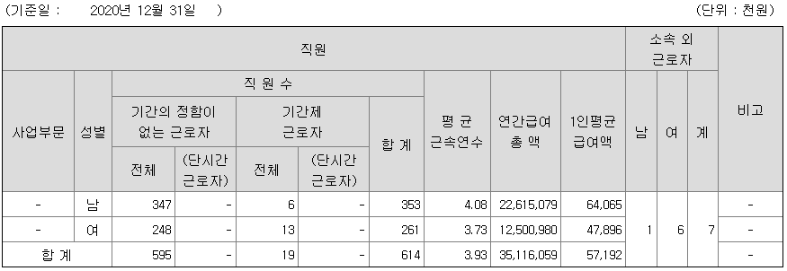 * 평균 근속년수 및 연간 급여총액 기준(20/12/31 재직자)
