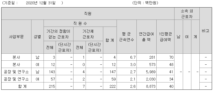 공장 및 연구소의 평균 근속연수는 남자는 2.7년, 여자는 2.1년으로 다소 짧은 편이다.