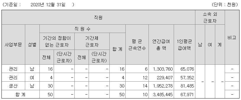 평균 근속연수는 관리직 남자 6년, 여자 12년이며, 생산직 남자는 14년으로 한번 입사하면 거의 퇴사를 하지 않는다고 보면 될 것 같다.
