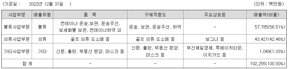 공시서류작성기준일 주요 사업부문별 매출액 비중은 물류부문 57,785백만원(56.51%), 의류부문 43,421백만원(42.46%), 기타부문 1,049백만원(1.03%)을 차지하고 있습니다.