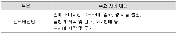 엔터테인먼트 사업은 최근 전 세계적으로 확산되고 있는 "K" 열풍에 힘입어 꾸준히 성장하고 있는 사업입니다. 이 영역에서 회사는 소속 아티스트의 영화나 드라마 등 작품활동 및 방송프로그램의 출연 뿐만 아니라 음반, 음원을 제작 발매하여 이에 따른 직접적인 유통수익과 더불어 공연 출연 및 MD상품 판매 등을 통하여 부가적인 수익을 내는 등 다양한 매니지먼트 사업을 핵심 사업으로 진행하고 있습니다.