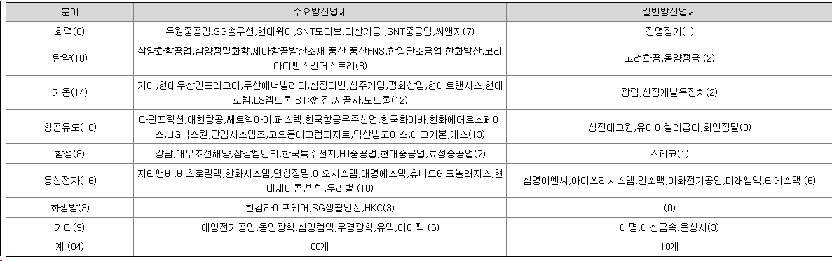 열거된 주요 방산물자는 대부분 복합, 정밀기술의 적용이 요구되고 있습니다. 그리고그 방산물자를 생산하는 업체를 방산업체라고 정의합니다. 방산업체는 주요 방산물자 및 방위사업청장 지정물자를 생산하는 주요 방산업체와 그 외의 품목을 생산하는 일반 방산업체로 구분됩니다.