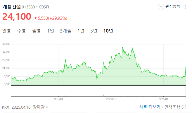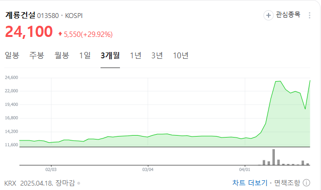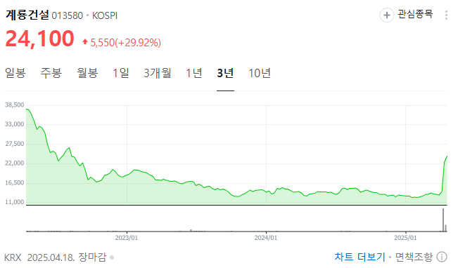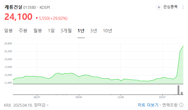 2025년 4월 18일, 계룡건설의 주가는 전일 대비 29.92% 상승한 24,100원으로 상한가를 기록하였습니다 . 이러한 급등은 세종시 행정수도 이전에 대한 기대감이 반영된 결과로 분석됩니다.