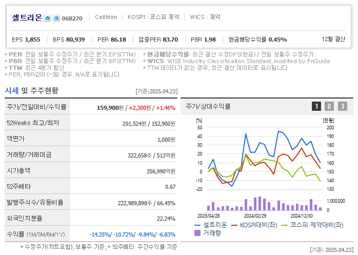 2023년 후반부터 셀트리온 주가는 다소 부진한 흐름을 보였다. 하지만 2024년 4분기 실적 발표 이후 긍정적인 시그널이 포착되기 시작했다. 매출은 전년 동기 대비 약 12% 증가했으며, 영업이익률도 30%를 상회하며 시장 컨센서스를 웃돌았다. 이에 따라 셀트리온 주가는 점진적인 반등세를 보이고 있다.