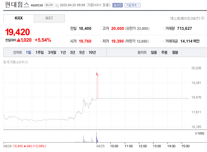 2025년 4월 24일 기준 현대힘스의 주가는 18,400원으로, 전일 대비 5.38% 상승했습니다. 이는 친환경 선박 수요 증가와 함께 수주 확대 기대감이 반영된 결과로 보입니다. 52주 최고가는 22,350원, 최저가는 9,580원으로, 변동성이 큰 편입니다.