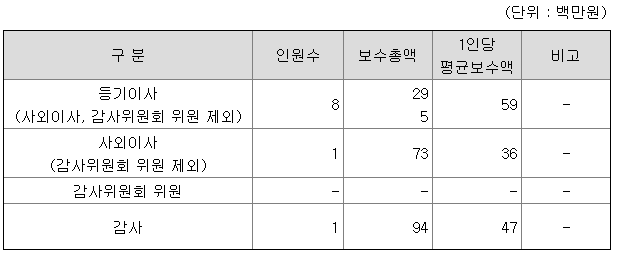 등기이사는 5천9백만원, 사외이사는 3천6백만원, 감사는 4천7백만원으로 생각보다 임원 연봉은 높지 않았다. 보통 등기이사의 연봉은 1억원을 넘지만...