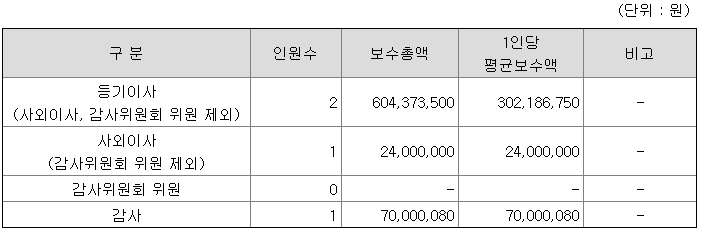 등기이사는 3억원이며, 사외이사는 2천4백만원, 감사는 7천만원의 연봉을 받는 것으로 나왔다.