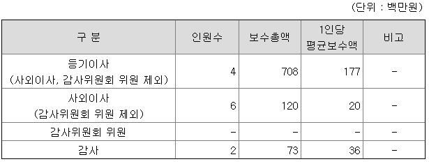 등기이사는 1억 7천7백만원, 사외이사는 2천만원, 감사는 3천6백만원의 연봉을 받는 것으로 나왔다.